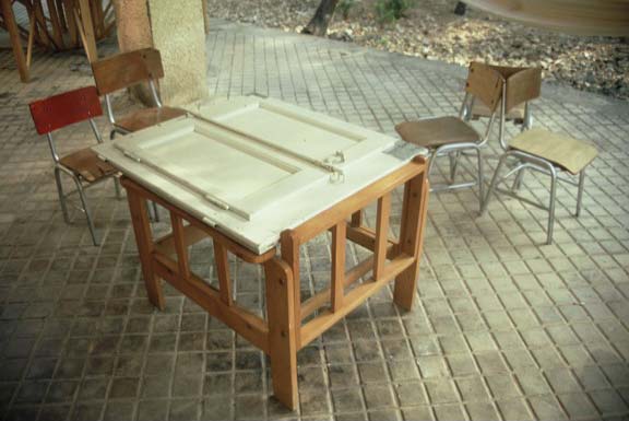 Ph Studio récupére le mobilier usagé donné par les villageois, l'école ou la mairie, redesigne ces chaises , tables et canapés , change le dessin et l'usage en fonction de leur passé, transforme le hangar en cinéma, la salle d'attente en bar, le quai en terasse, la cuisine en librairie.